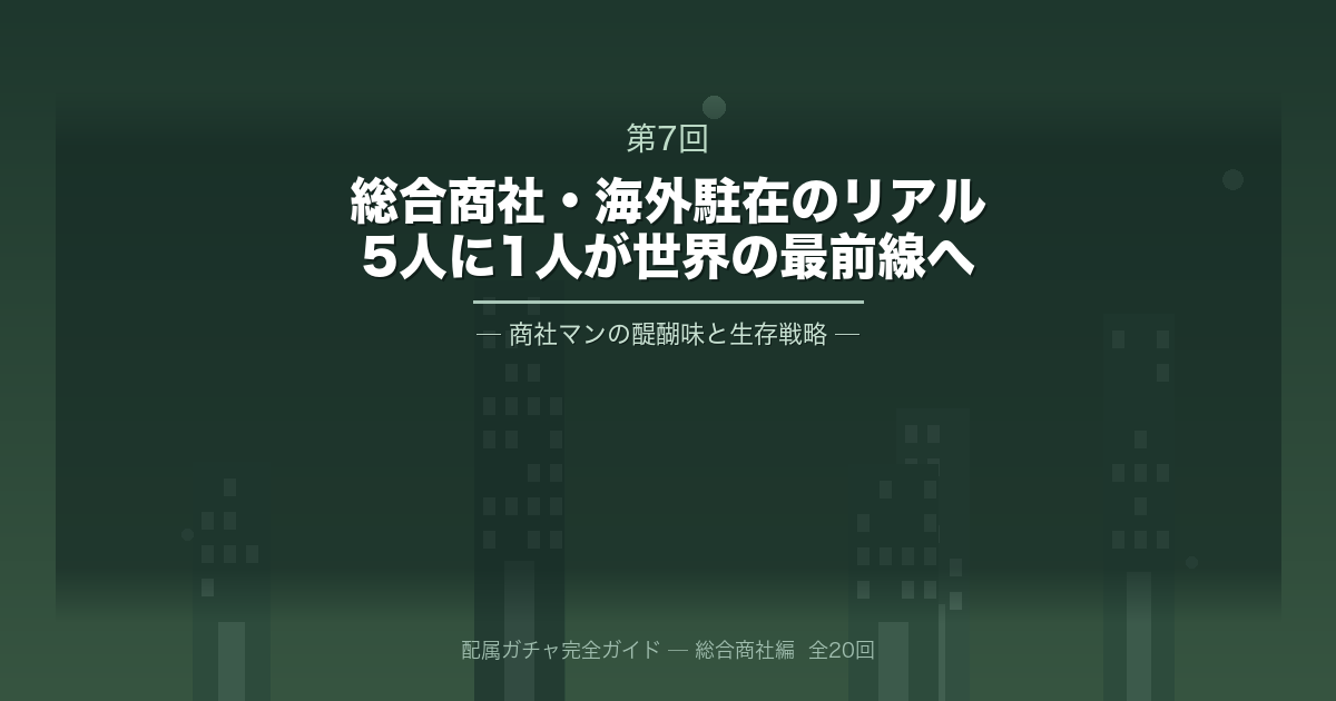 第7回は、総合商社編の最終回「海外駐在のリアル」です。「商社といえば海外駐在」——就活生の多くがこのイメージを抱いているでしょう。実際、総合商社では約20%の社員が海外駐在員として世界中に赴任しており、5人に1人が海外で働いています。中東、東南アジア、アフリカ、南米——世界中のあらゆる地域で、商社マンは現地の最前線に立っています。