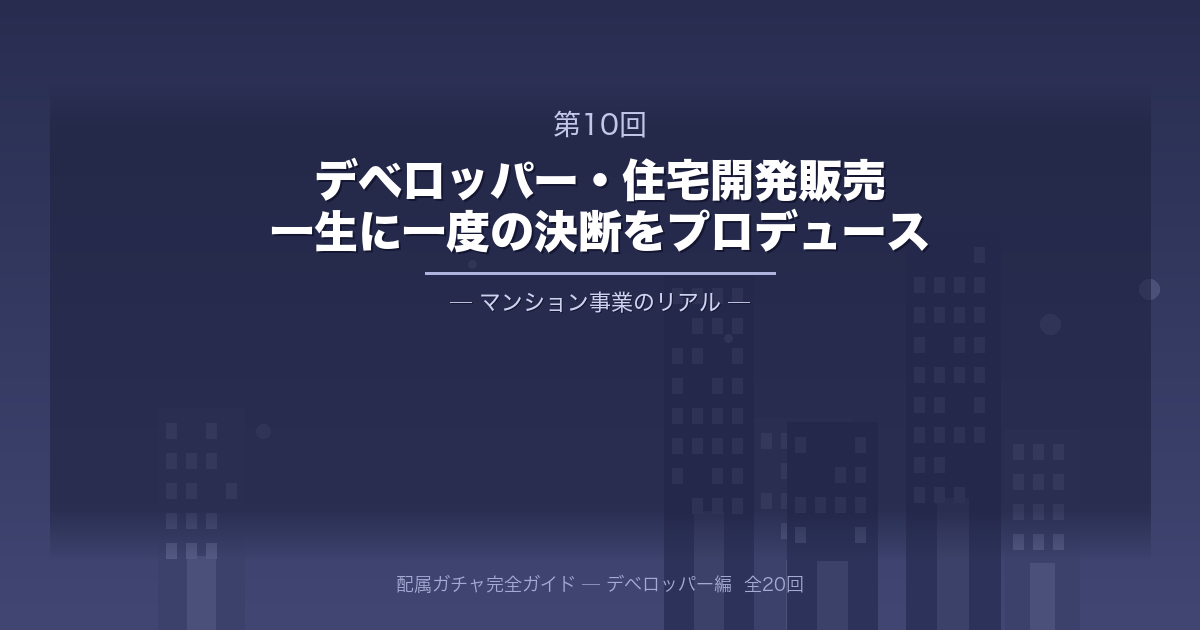 第10回は、大手デベロッパーの収益の柱である「住宅(マンション)開発・販売部門」です 。数千万円から数億円という、個人のお客様にとっての「一生に一度の決断」を形にする部署の仕事内容や働き方に迫ります 。