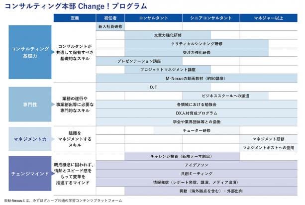 "変化"の激しい時代に対応し、自らを"変化"させて成長し続けるコンサルタントを育成したいという想いを込め、育成体系の総称を「Change!プログラム」と名付けています。