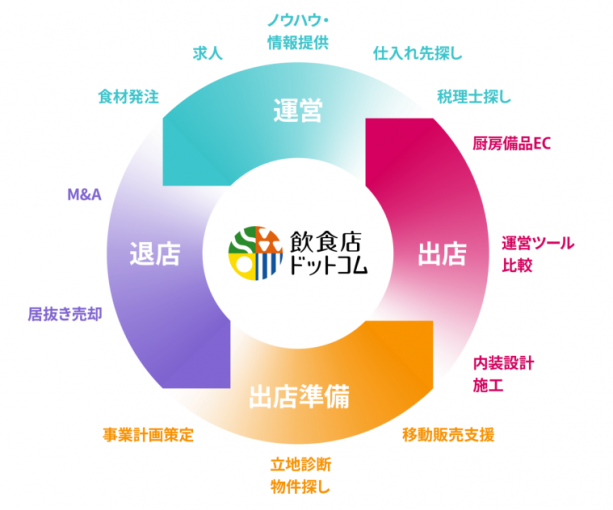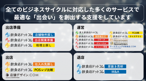 幅広いユーザーに対し「店舗物件探し」「人材採用」「飲食事業を売却先探し」などの様々な課題解決に導く業界独自のプラットフォームを展開。