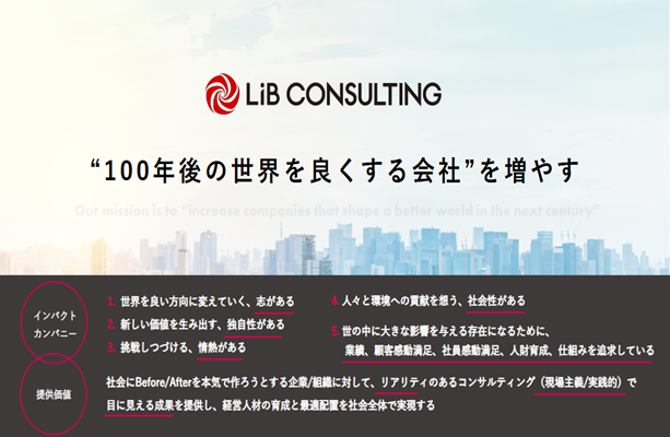 これが私たちリブ・コンサルティングの創業以来変わらないミッションです。ミッション実現に向けて私たちは、事業やサービスによって社会変革を生み出す「インパクト・カンパニー」を支援しています。