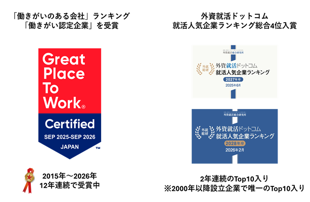 また採用活動についても力を入れており、外資就活ドットコム 28卒就活人気企業ランキング総合4位入賞・2年連続のTop10入りを果たしています。(※2000年以降設立企業で唯一のTop10入り)