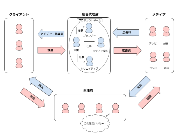 「クライアントの課題を広告で解決すること」が広告代理店の基本的なビジネスです。代理店のため、広告の制作やメディアとの交渉などクライアントの広告業務を代理で行います。