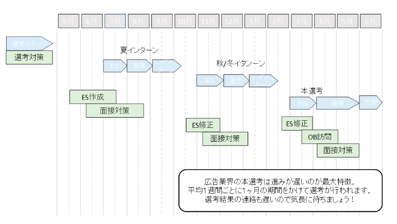 他の業界と比較して面接開始時期が早く、選考と選考の間が長いのが特徴です。